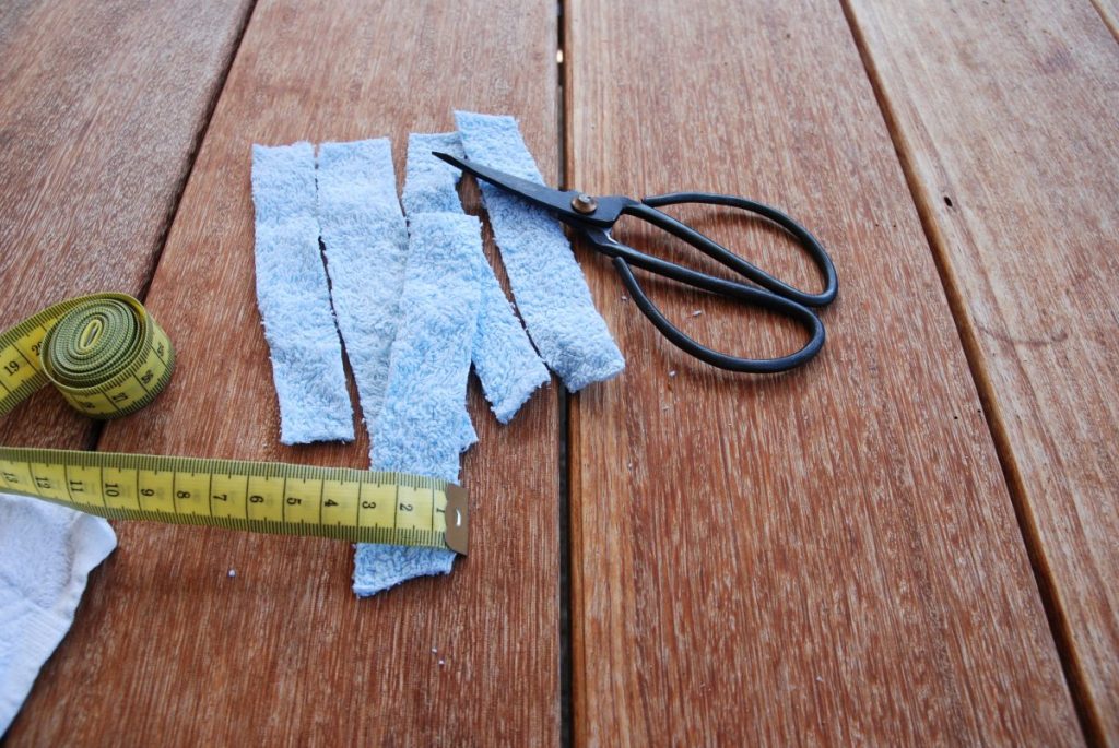 Handtuch / Schwammtücher in ca 3 cm breite Streifen schneiden.
