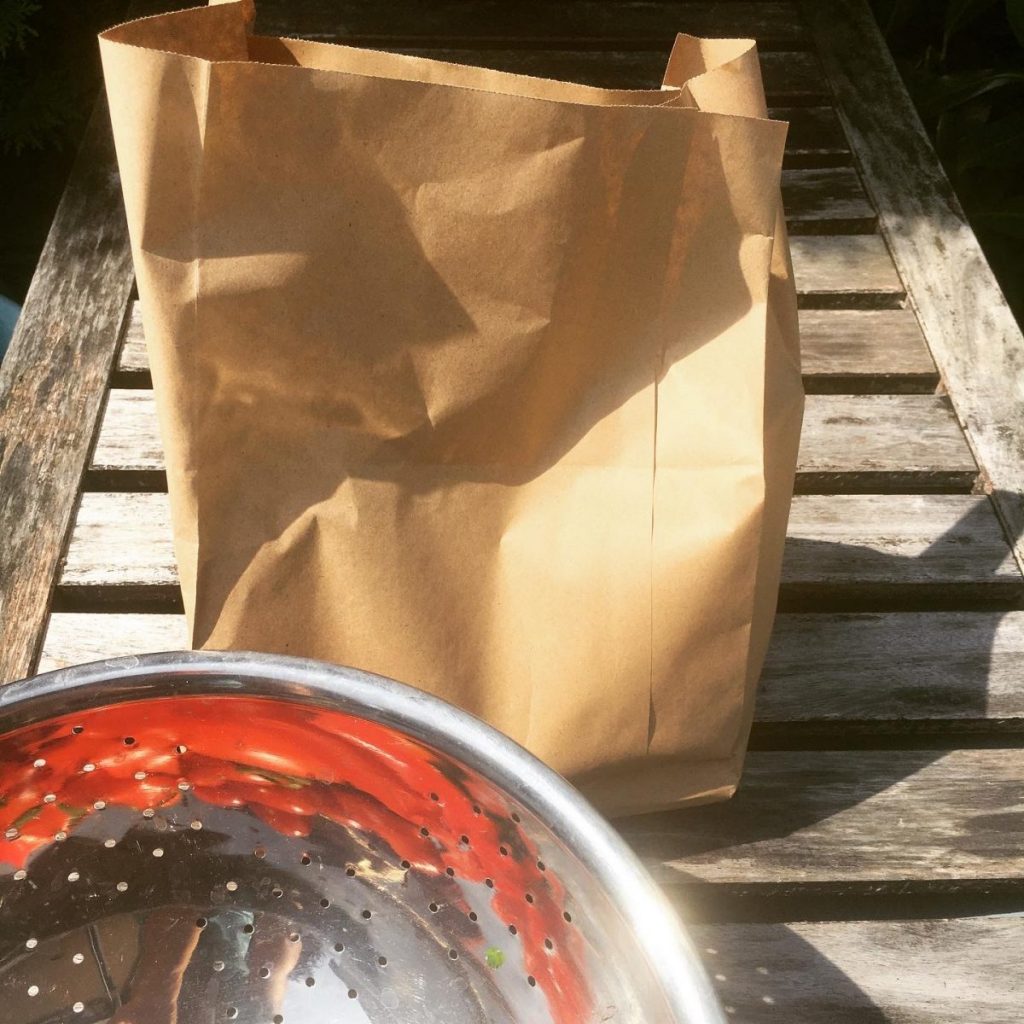 Ich packe die grünen Tomaten in eine Papiertüte & lege einen Apfel dazu.